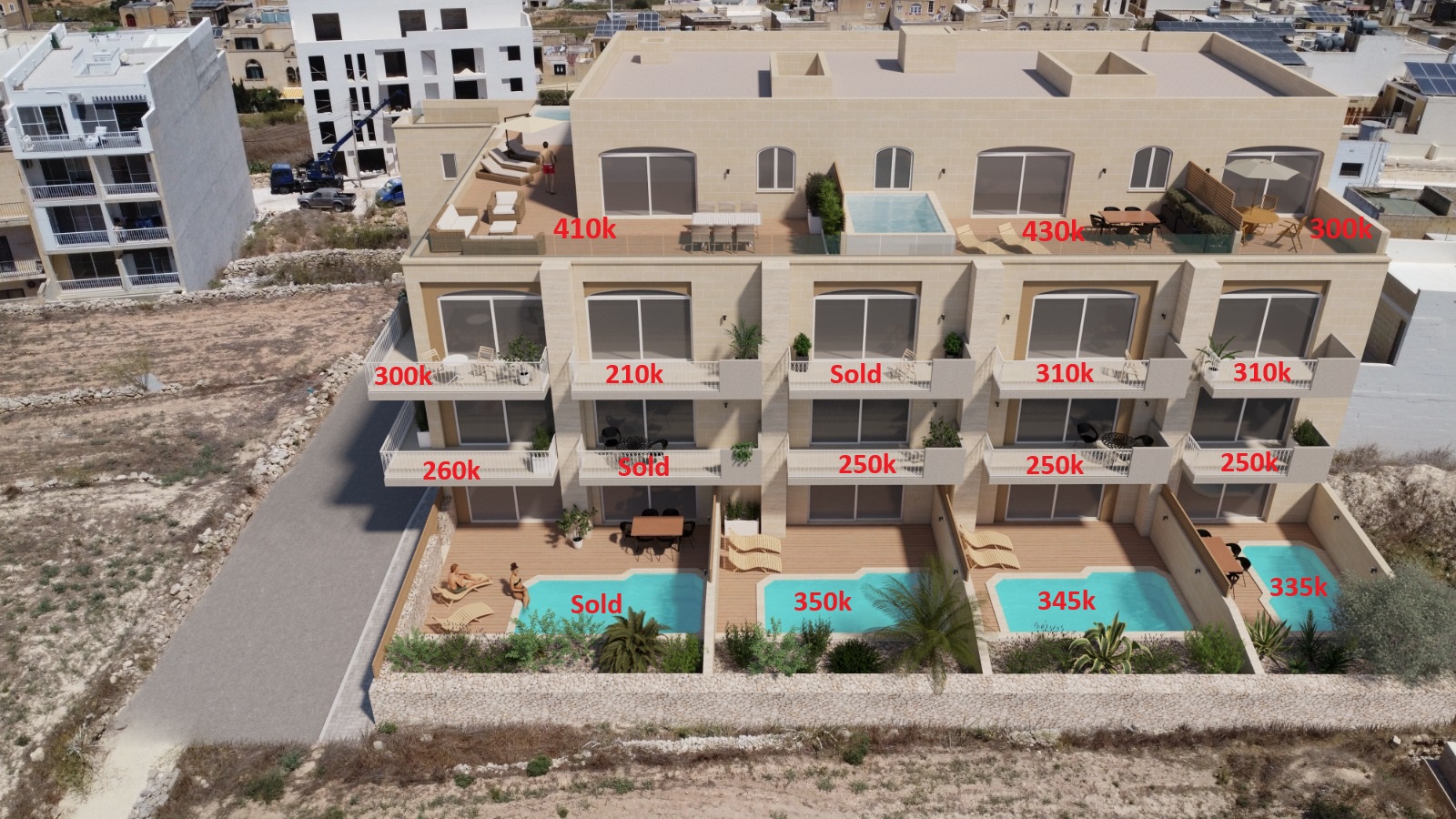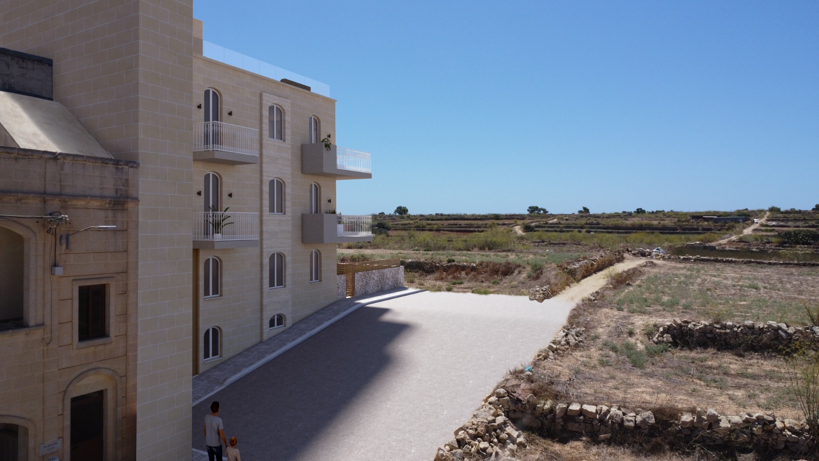 Presently being built is this very nicely planned corner block, located at the village outskirts, at edge of scheme, enjoying open country views. Prices start from eur210,000 for a 2 bedroomed apartment on the 2nd floor overlooking the open views from a South facing terrace. Lift and common parts included. Contact us for more info. Optional garages. Very good location.