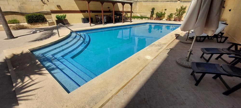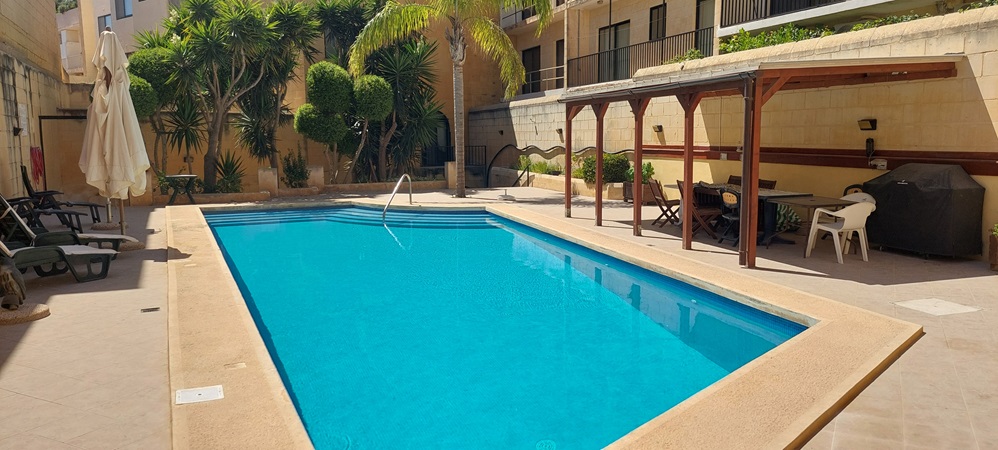 Exceptionally maintained is this large family apartment, located on the cliff's edge enjoying staggering sea and country views from a spacious west facing terrace. Forming part of a classy block, this property offers a lounge/dining area leading to terrace, fully equipped kitchen, 3 double bedrooms (main en-suite) and bathroom. Complimenting this property is the use of a large communal pool. Includes a washroom, a store room and a car port in a lock-up garage. A/c throughout. A pellet burning stove warms up the place during cold winter months. Ready for immediate occupation. Stunning sunset views. (sept 2025).